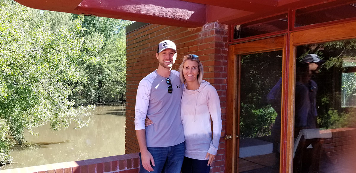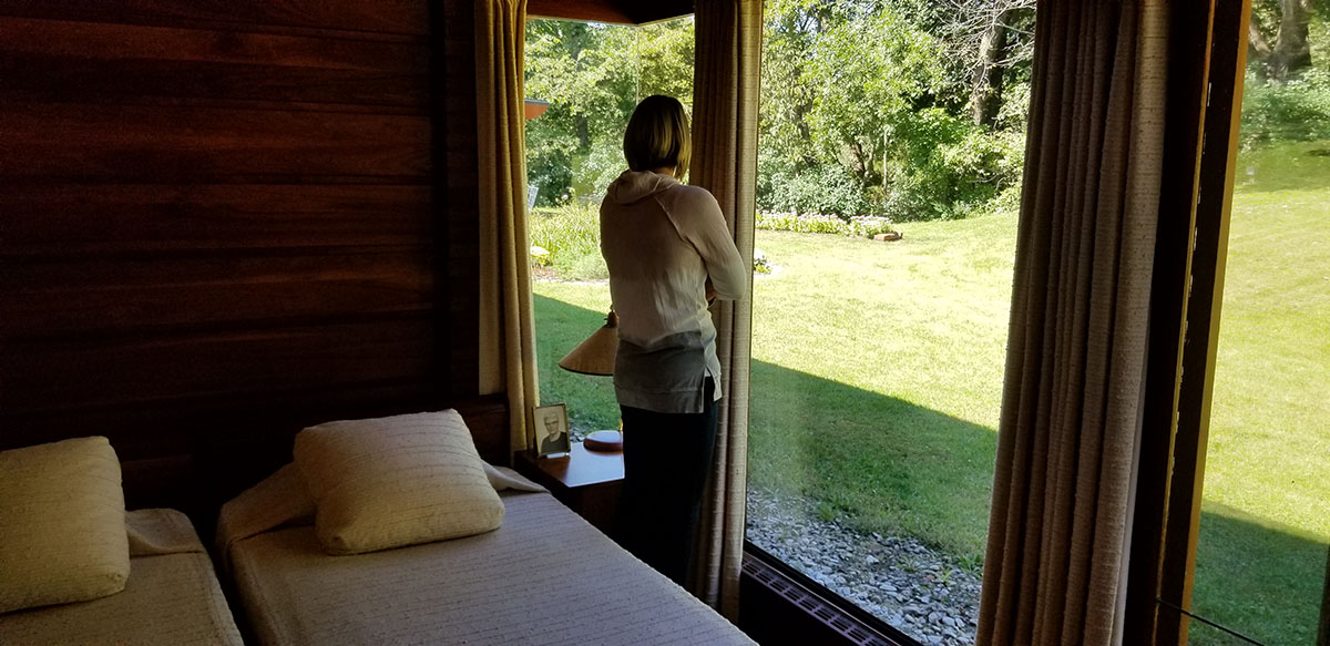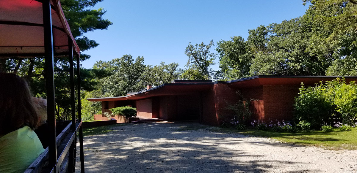The tour begins at a newer building that is part museum and part gift shop. It started with a guide talking about the property next to beautiful wooden boat that was owned by the Watlers and actually driven on the Wapsi River. The guide spoke about how the Walters earned their fortune, how they helped their neighbors during the depression by buying their properties but allowing them to still farm and many other facts about the couple. We were then directed over to a wagon pulled by a tractor and were given a ride to the actual home built by Frank Lloyd Wright (FLW).