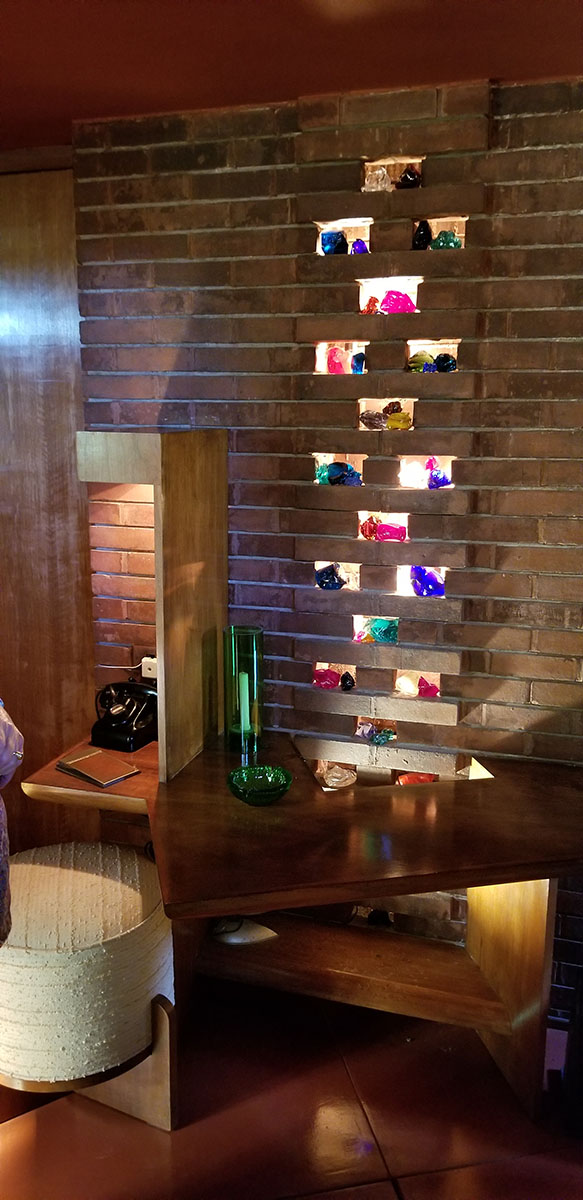 Once there, I was extremely surprised to see how simple the house was on the outside. It seemed very plain and unimpressive. But once we walked in, my opinion changed drastically. Nearly everything in the house was designed by FLW including the furniture. When you first walk in, there is a dark entry way with some neat looking decor including a cool desk. It was later explained that the other rooms were purposely give less light and design detail so the living room area was more impressive when you walked in.