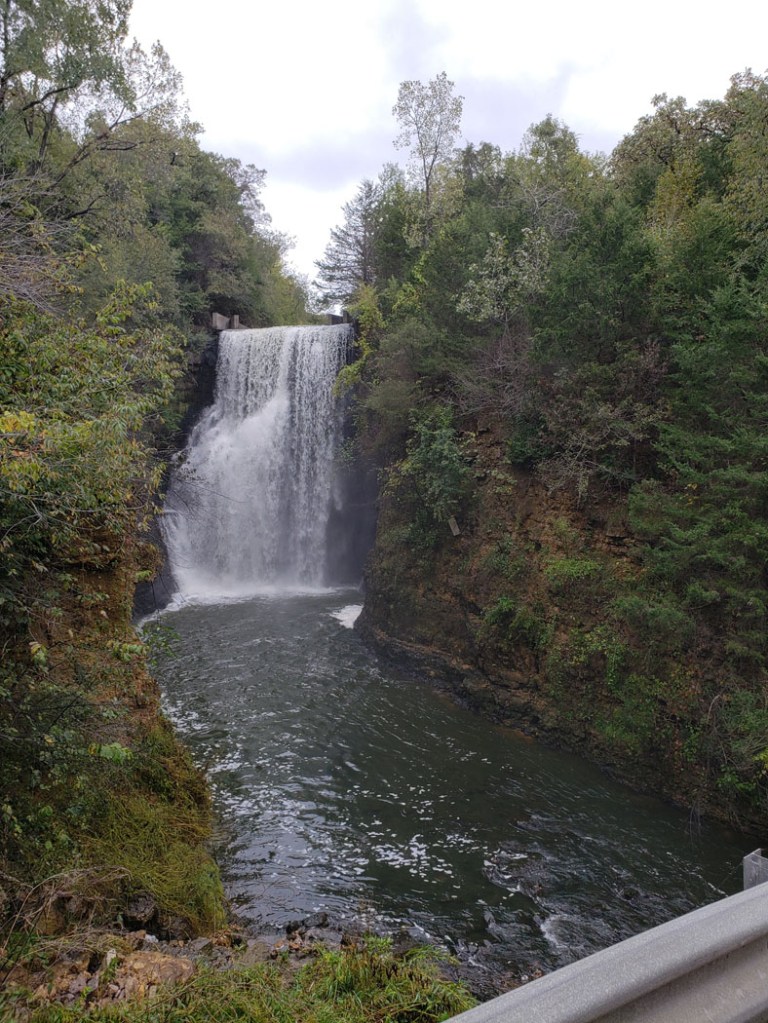 The RZR was low on gas so we settled on taking the Ranger around the trails. Our new friends had told us about the trail that went around the lake and it took us a while to find it, but once we did, and realized it was all gravel, it was easy to follow. Since we now had our barrings, we packed a cooler and set off on our journey. There were several paths that led to the lake and we would venture off to check out the boats at the boat docks and the lake-side scenery. The path we were cruising along on was surrounded by a canopy of trees and beautiful nature. When we got to the south end of the lake, there was a gorgeous waterfall from where the man-made lake was damned up. We stopped to enjoy the view for a bit, enjoying the roar of the waterfall and the mist that bellowed up from the creek and then headed on our merry way.
