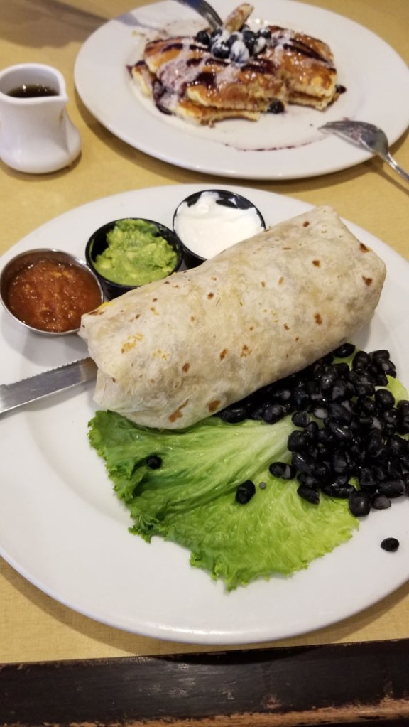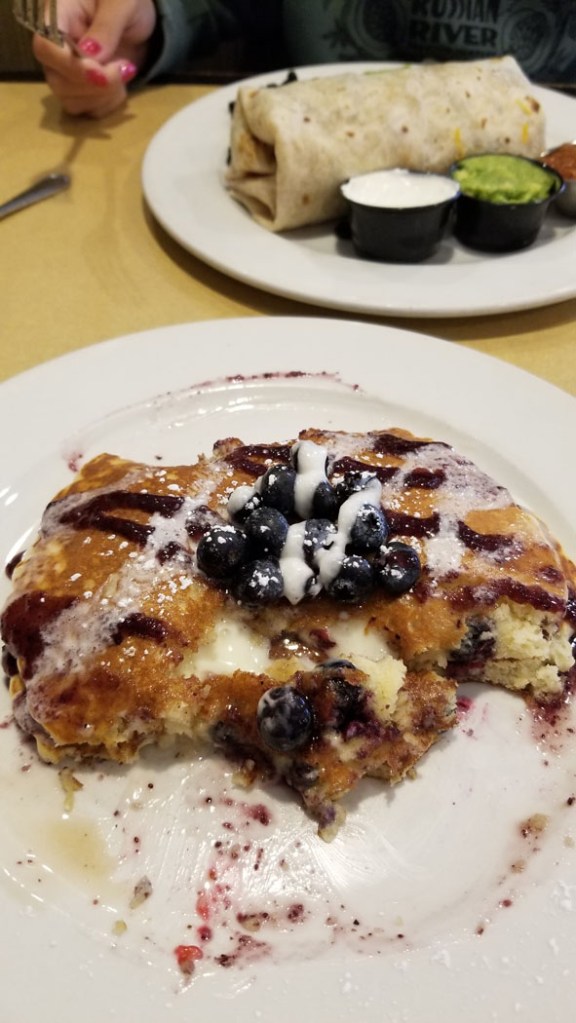 Fast forward to morning and we said our good-byes, expressed our gratitude, and headed out for some breakfast. We picked a place called Brunch Cafe where we split an order of blueberry pancakes and a breakfast burrito, and of course Jill had to get a strawberry mimosa to celebrate hitting her goal. This food was amazing and the service was outstanding. The pancakes had blueberries and blueberry sauce drizzled all over and a “brunch cream” spread between the two fluffy cakes. Jill went to the bathroom shortly after we ordered and to her surprise, she returned to our meals on the table and these pancakes nearly half gone. The burrito, too, was incredible. The chorizo was juicy and potatoes crispy. All the veggies and extras were fresh and flavorful. It was a great start to date day.