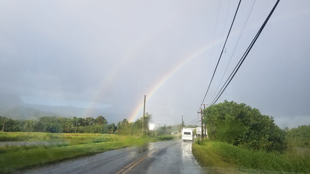On the drive to the shuttle, we saw the most incredible double rainbow. It was the brightest I’ve ever seen. It was so vibrant and so close. I felt like it was touching my windshield. It was like I was driving through the thing and my windshield wipers were trying to wipe it off. I started to think that I would start seeing leprechauns and unicorns I was so close to this thing. I wondered if rainbows like this were common here, since rainbows in general are common in Hawaii but I was delighted when the guy from the shuttle service was geeking-out about the rainbow too. We talked about how bright and close it was and he, too, wondered where the pot of gold was. 🙂