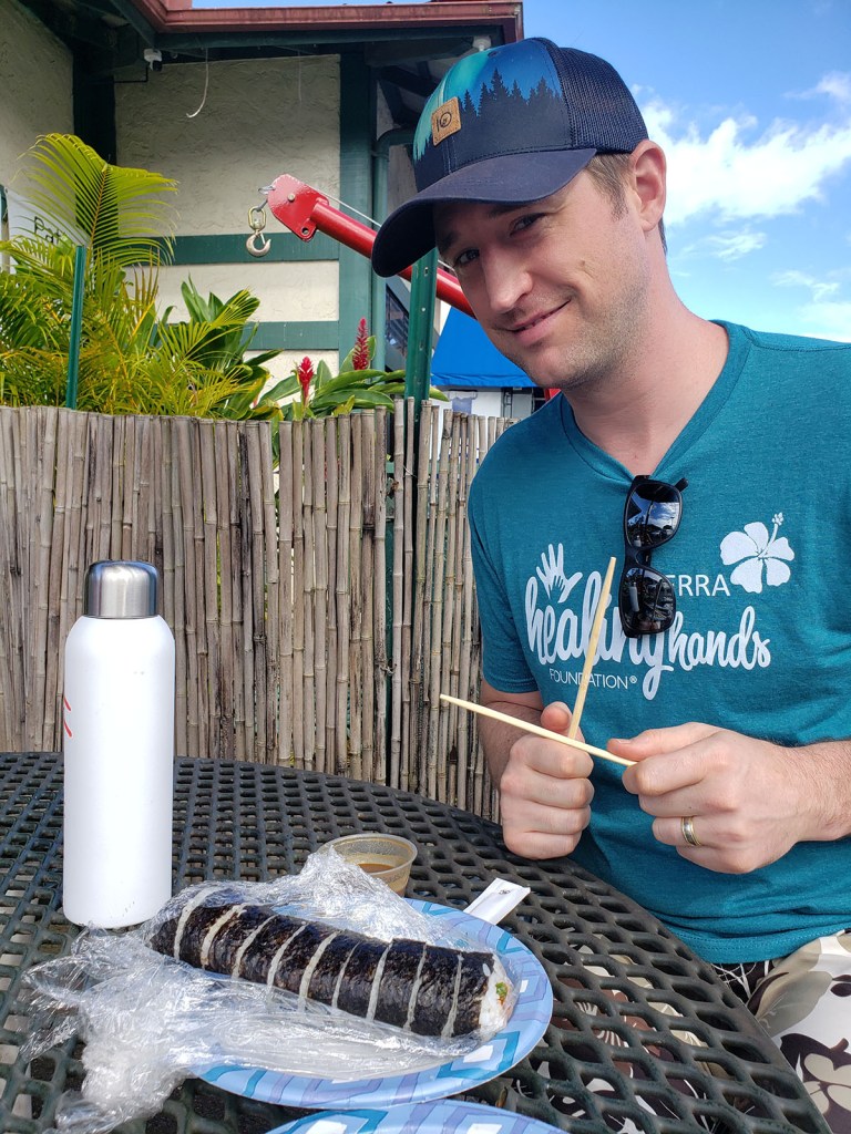 After that experience, we decided to look for a place to take a dip in a part of the Pacific that wasn’t try to kill us. On our way through Hanalei, we stopped at a food truck joint and got some sushi from a food truck, Hanalei Poke. I was so hungry and ate so fast I’m not sure I really even tasted it, but Jill said it was good. After lunch we settled on heading to Anini Beach, a beach that is much calmer due to the cove like area it is in. We found a parking spot and I attempted to do some snorkeling here, but there was nothing in the water but salt and sand.