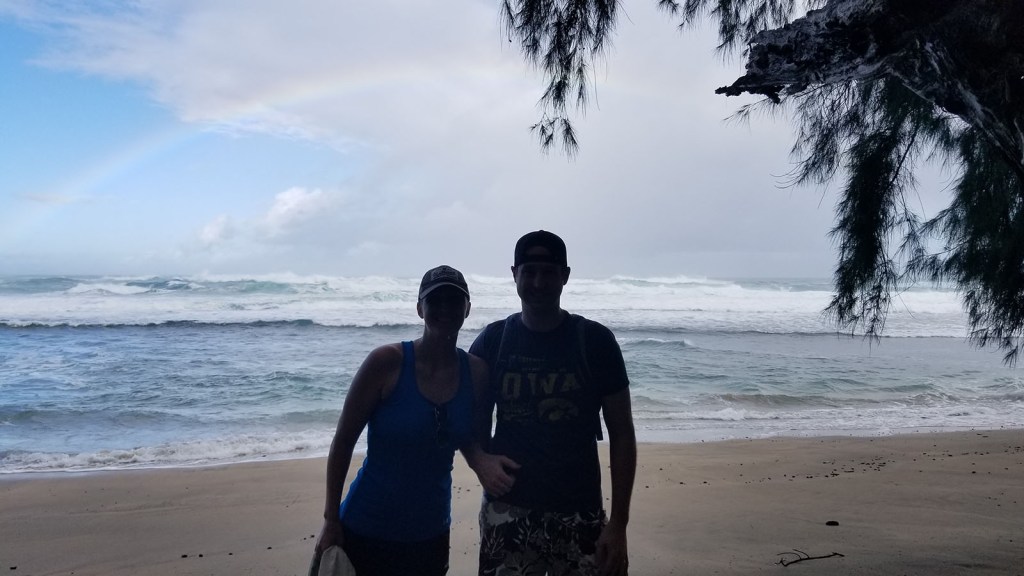 Since we had been waking up fairly early during the whole trip, I was up before the sun and tried to catch the sunrise on the beach. Jill woke up when I was crawling out of the tent and joined me, but the overcast made it a fairly non-eventful scene. The Kumu Campground served coffee out of an old shipping container turned into an office. Jill was able to get her caffeine fix and then we packed up and headed off to catch a shuttle to the Napali Coast State Wilderness Park.