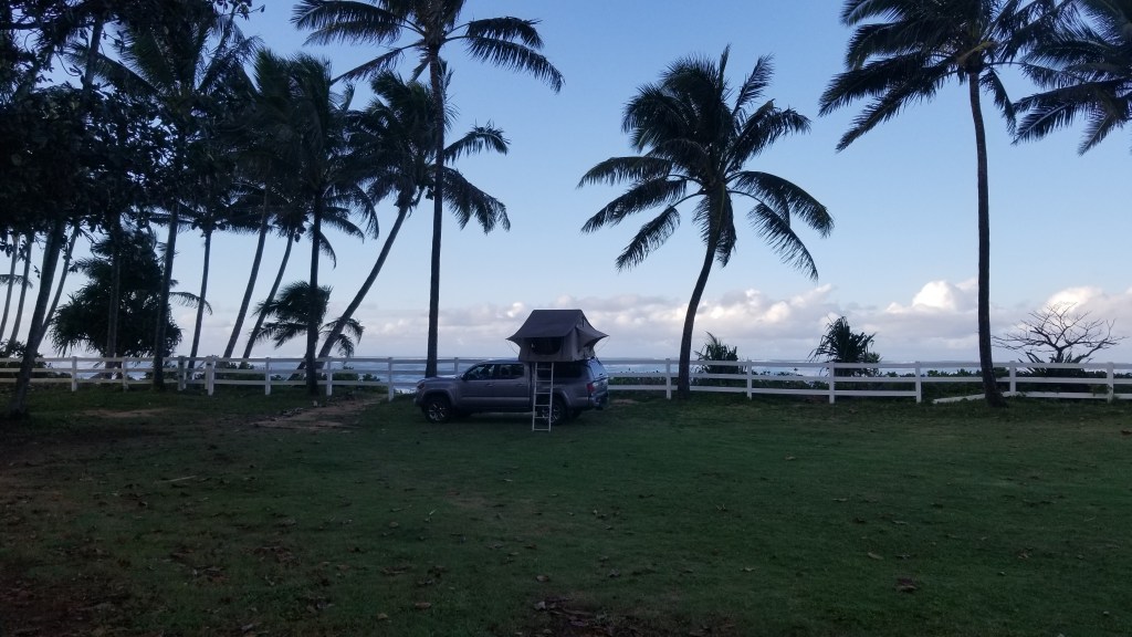 The YMCA Campground (Camp Naue) was simply an open lot where you could park your tent or camper. There were no designated spots, and the only rules were: make sure you are there by 7:00 pm and don’t park under the coconut trees. The host was super nice. He had a 8 week old Mastiff puppy that we snuggled on for a bit and then he offered us some fresh banana bread that a neighbor of his baked for him. It was so fresh, it was still warm! We set up our tent with an ocean view and snacked on some banana bread and then went for a walk along the beach, catching another beautiful sunset. We came back and ate some cheese and crackers and headed into bed.