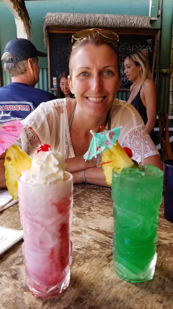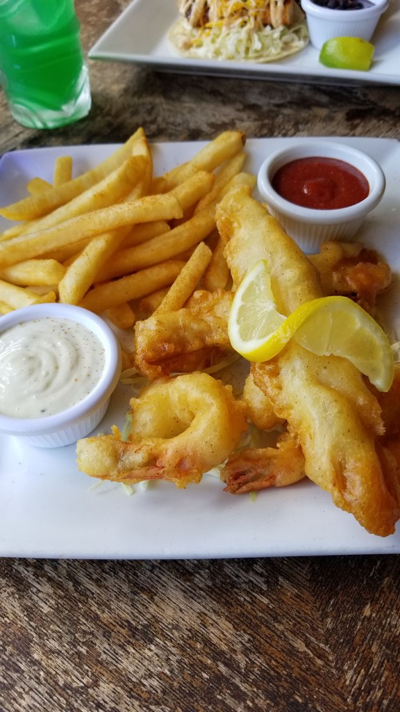 By this time we were super hungry and decided to find a place to sit down and eat, instead of our usual food truck lunch. We found some businesses in a strip mall location that had some restaurants and started our hunt for a place to eat. We settled on Garden Island Grill, got some fruity drinks and ordered some food. There was some funny little lizards that were licking on a cherry on the railing next to us. Jill got the fish tacos and I got fish and chips. The fish and chips was okay, but I wished I would have gotten something else. The location was cool though and Jill loved her tacos.