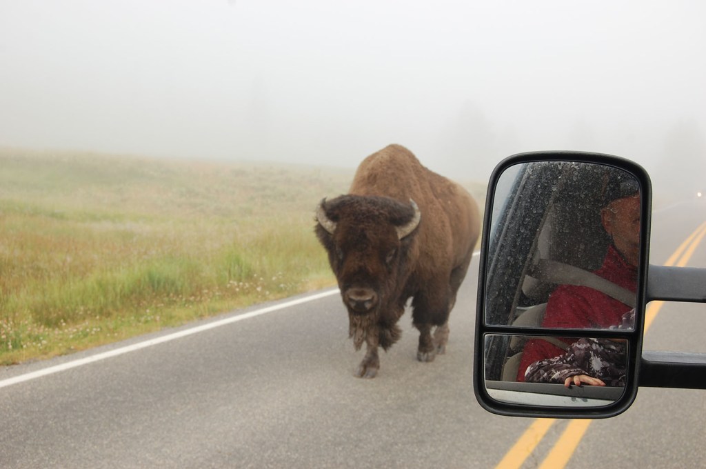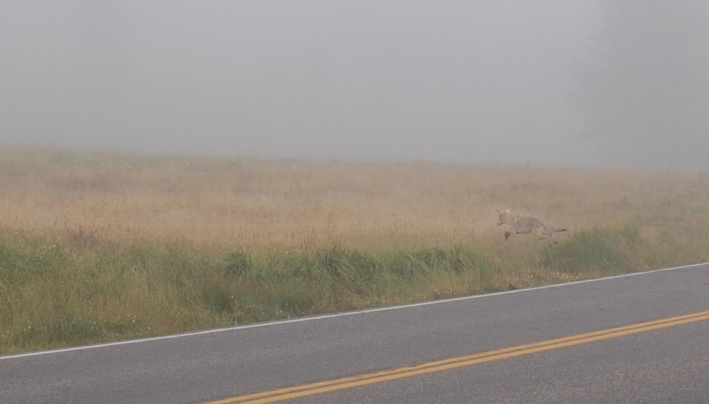 As we approached Hayden Valley, traffic was at a crawl. That usually means there are animals close to the road. Sure enough, as we got closer, we started to see buffalo moving through the thick fog. Once the fog burned off a bit, we could see there were more buffalo out there then we could even count. As we waited in the traffic, a young coyote crossed in front of us and we watched him hunt for breakfast in the tall grass.