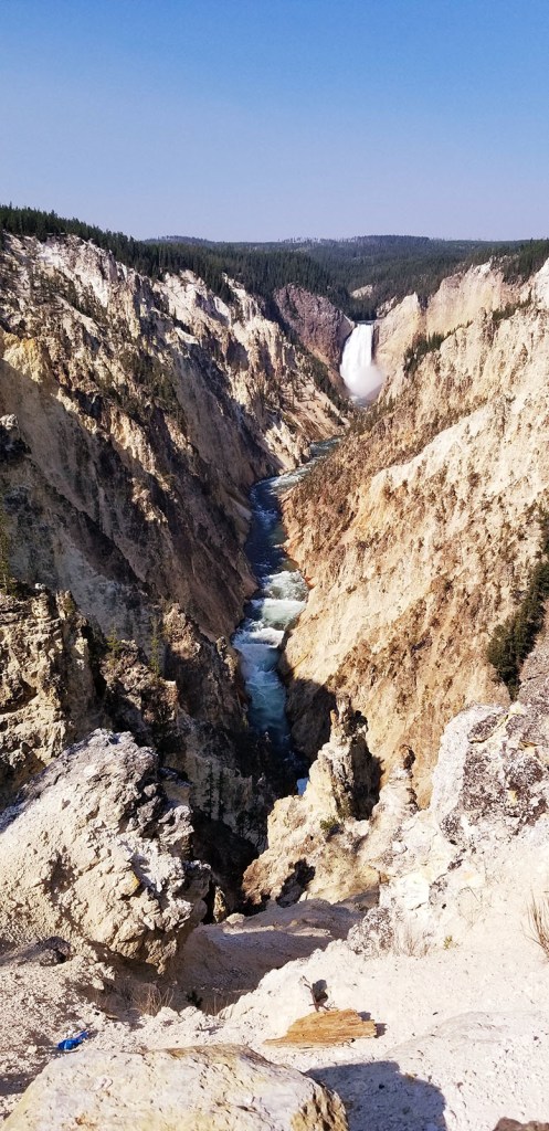 Our first stop was Artist Point. This is a beautiful scenic area overlooking the Yellowstone Falls from the south rim of the Grand Canyon of Yellowstone which was carved out by… you guessed it, the Yellowstone River. It really is a breathtaking view, not only because of the massive waterfall in the distance, but the pine trees, river, and cliffs are also something to behold. As if this all wasn’t enough, the mist from the waterfall floats up, and on a sunny day, you can see a rainbow effect from the sun shinning through it. It’s not hard to see why they call it Artist Point. It’s so inspiring.