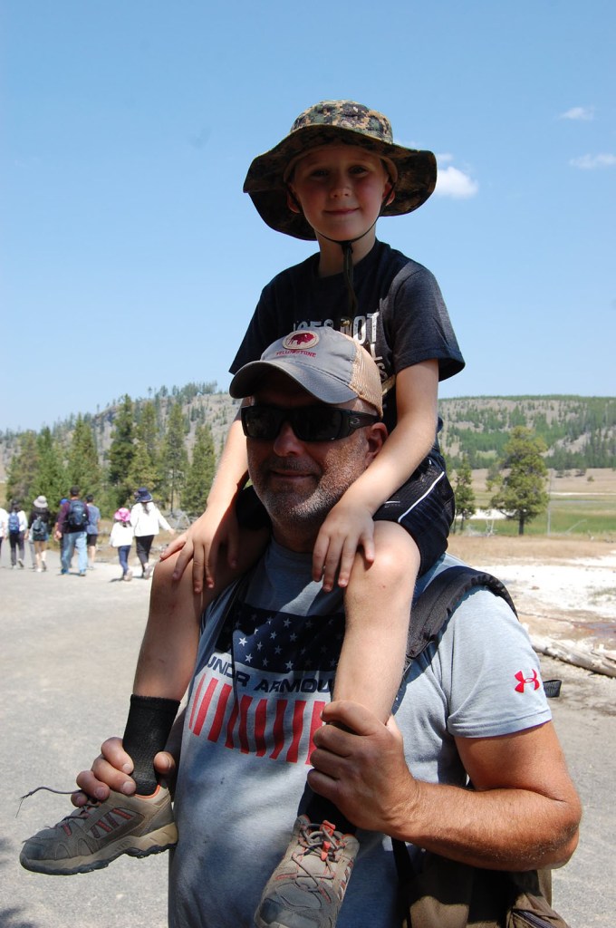 Instead of parking where you can get out and walk along the boardwalk right on the Grand Prismatic Spring, we parked near a trailhead and climbed up on a 0.6 mile trail so we could see the spring from above. It was another hot and steamy day at Yellowstone so we ducked into the shade any chance we got. The view from the top was spectacular. Reddish-orange fading to yellow to green to blue. It was a bit crowded at the lookout, but we still managed to get some fantastic photos.