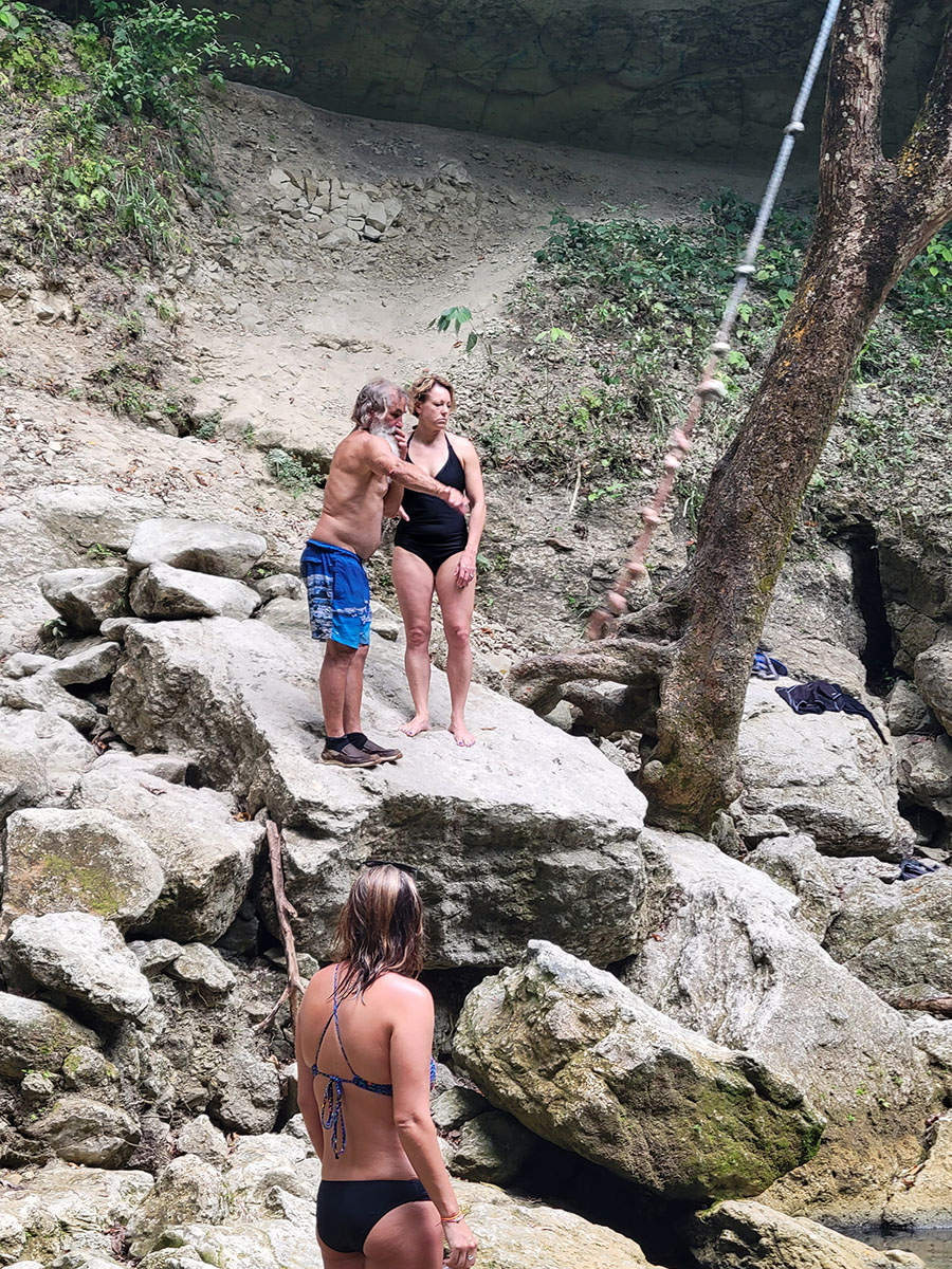 We all thought that sounded worth checking out and hiked the muddy trail upriver to find another waterfall and pool. The pool was smaller, but there weren’t as many people. This pool came complete with a bearded man with a long stick that helped get the rope swing for people and provide words of encouragement before you jump. It was a lot of fun so I did it twice. Lisa even joined in on the fun.