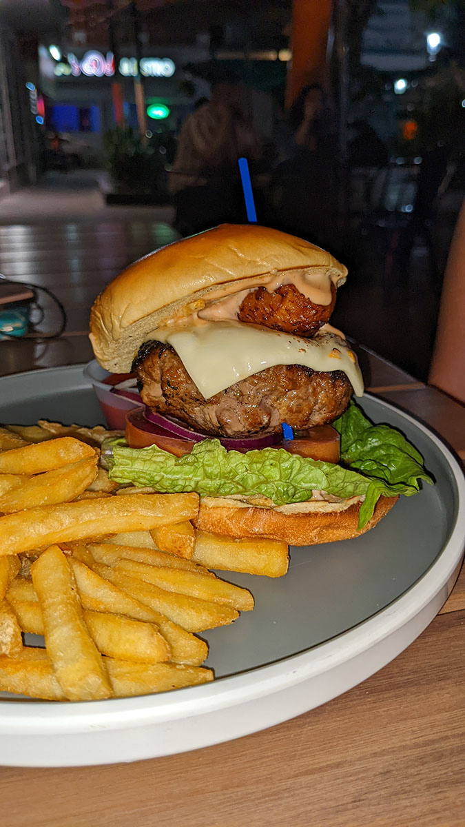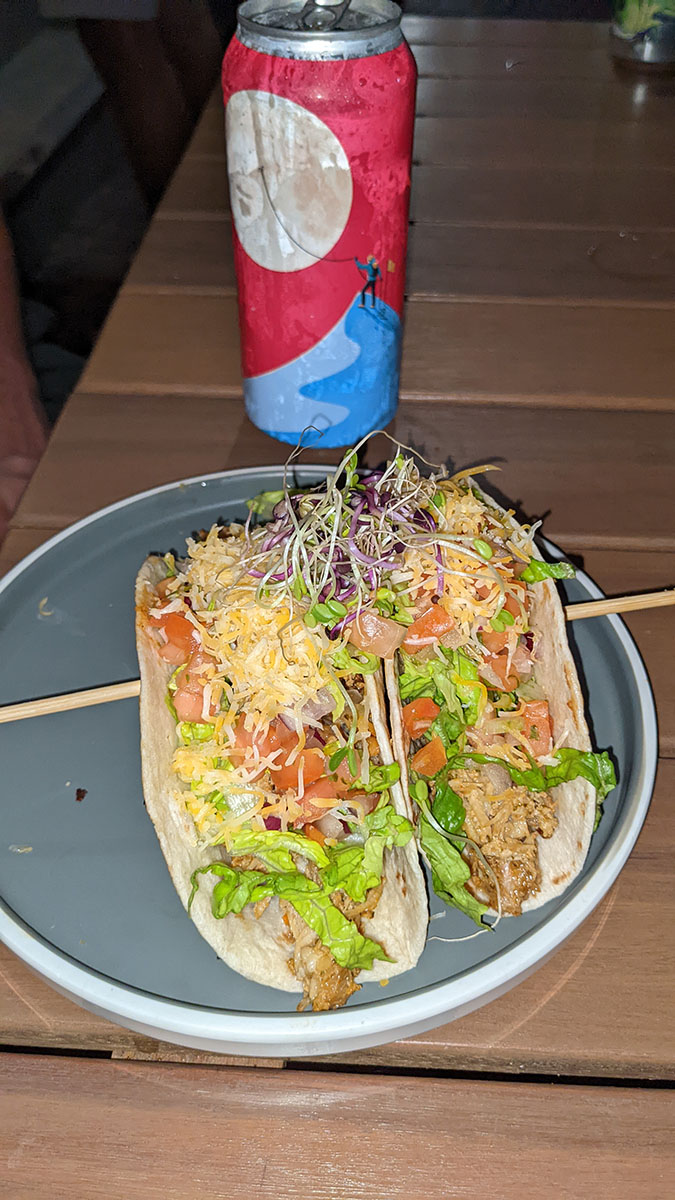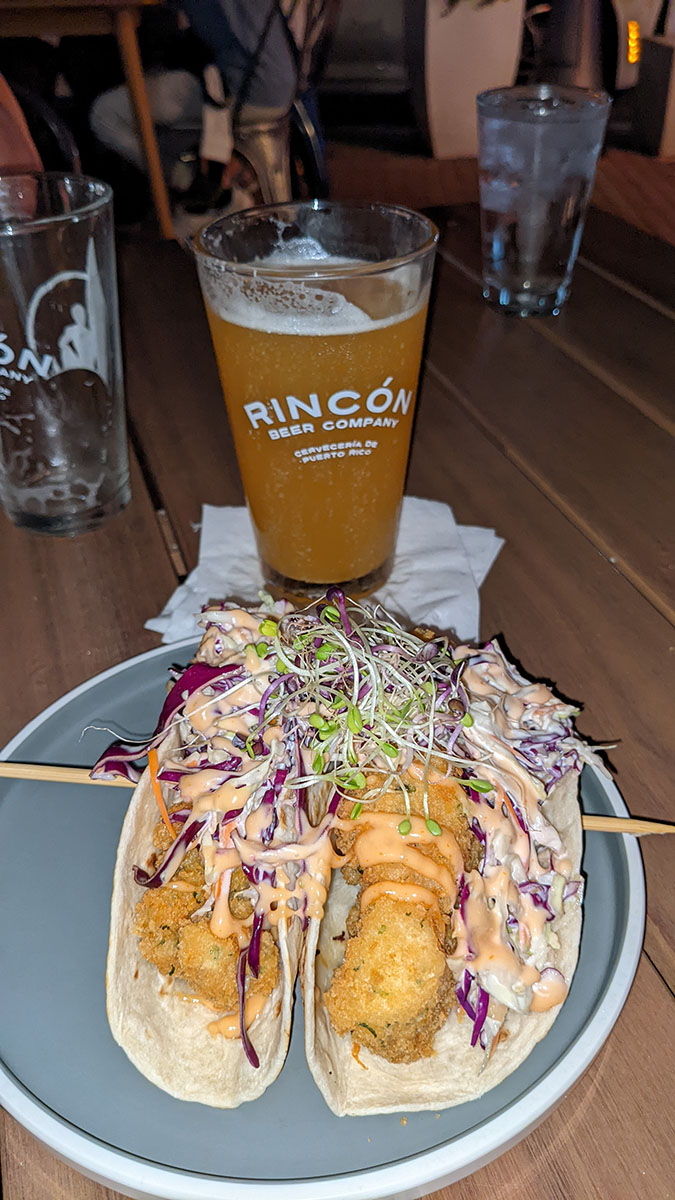 We ordered our drinks and food and as we sipped our well-earned beverages a guy proposed to his soon-to-be wife right there in the restaurant. We all enjoyed our drinks. Jill bought the thickest “beer” I’d ever seen in my life. It was a smoothie sour by Prison Pals Brewing Co but you almost had to chew it before you swallowed. It was delicious, but filling, and I had to save room for my Tripleta, Puerto Rico’s finest sandwich, or at least that is what the server had told me. Jill doubled down on the fish tacos, having had them for lunch and dinner. Our travel buddies got a burger and pork tacos. We enjoyed our dinner and drinks at a table under an umbrella as it rained off and on. It wasn’t long before the long day caught up with us and we headed home for bed.