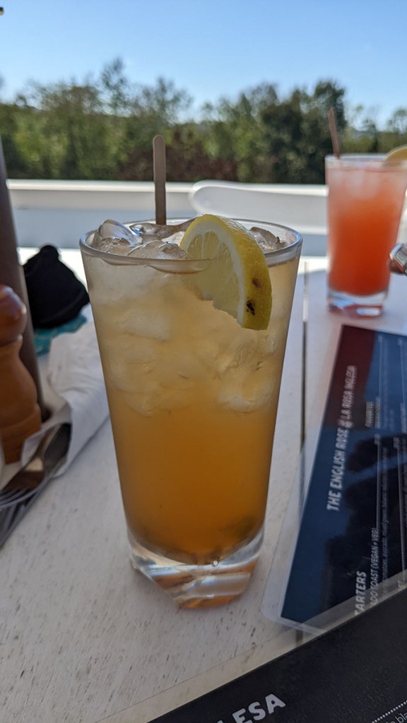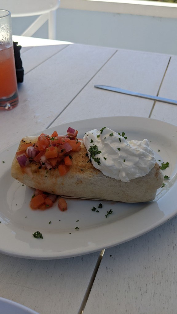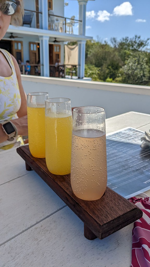 After a while, we started getting hungry and had plans to go to a cool breakfast place with a great view, The English Rose, so I was excited to move on and have a good breakfast. I was also a bit excited for a drink. The day before, we had discussed that this day, March 3rd, would be a good day for day-drinking and just enjoying paradise with a drink in hand since we could sleep off any potential hangover the next day and be in ship shape for the flight the following day. Jill got a mimosa sampler with different types of juices and I tried my first Chi-Chi Rodriguez. The sun had already started feeling very hot so we hid from it as much as we could under the table umbrella. Our omelet and breakfast burrito were delicious and the two couples next to us were nice enough to snap some pictures with the ocean view behind us.