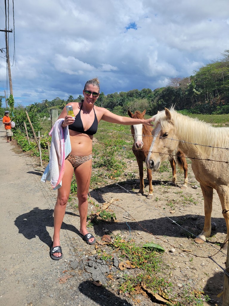 There wasn’t enough rum or patience for me to stomach the pain from us trying to pull that last piece out of my finger, so I wrapped it in a band-aid, put on a fresh layer of sunblock, and we headed to Sandy Beach, the beach directly down the hill from our rental house. As we were parking Jill spotted a few horses in the nearby field and gave them a bunch of attention before we made our way to the beach.