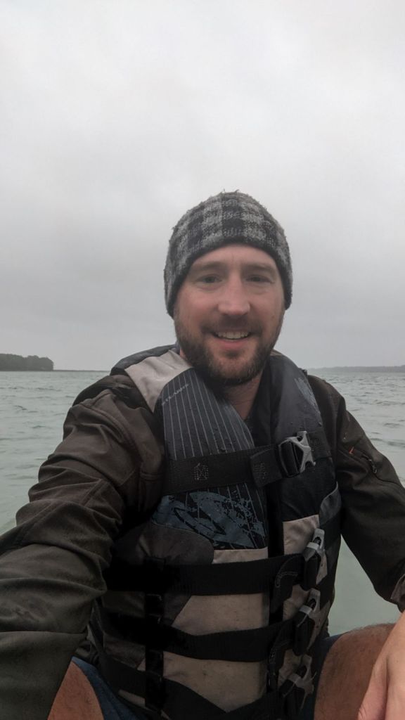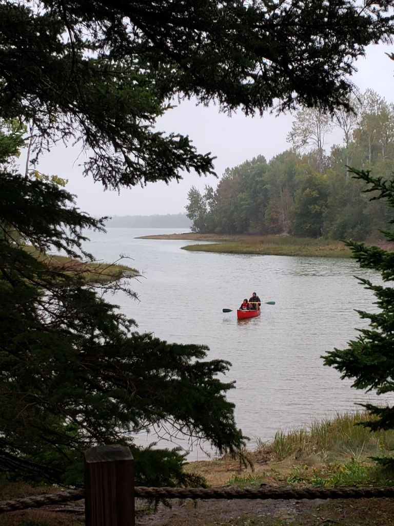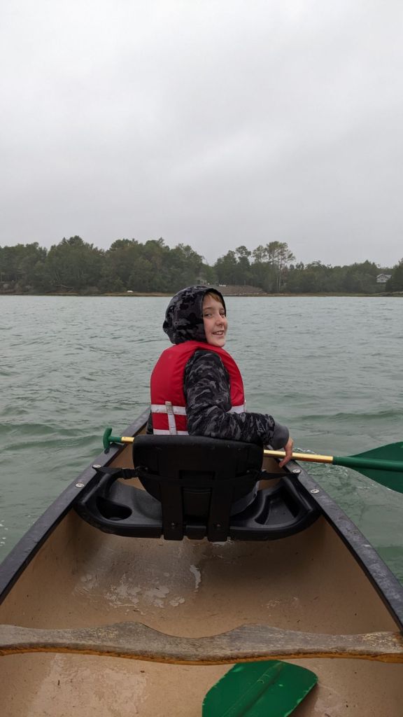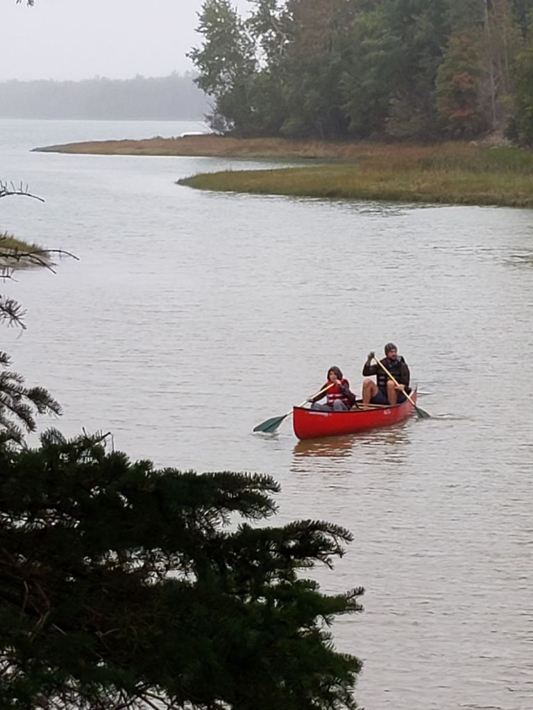 We knew that the weather forecast was for rain all day but it hadn’t started yet so Mattix and I wanted to get an outdoor adventure in before the rain. We hadn’t had the canoe out on the cove yet so we drug it to the shore and dropped it in. We paddled around for a bit before we let the wind blow us back in. It was a thick mist in the air and the strong wind made it uncomfortable and difficult to make any good headway in the canoe. Mama was in the lower cabin, keeping warm and out of the rain, watching us while she read a bit and drank her coffee. Charlie was still in bed in the main cabin sawing logs (snoring away).