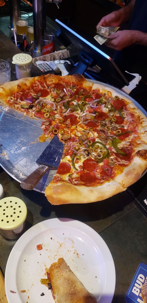 We sat and watched and listened for a bit before hunger hit us. We jumped on our bikes and head back south looking for a place to have dinner. We landed on Pizza n Brew. They were pretty busy, but we found a seat at the bar. It was good thing we were hungry because the pizzas only come in one size, 18 inches. We ordered a PNB Supreme and sipped on a few drinks while we waited for our pizza. The pizza was delicious but we still only managed to eat half of it. When we were getting ready to ask for a box and our check, the bar tender asked us how hungry we were. I replied, “Oh no, we are going to need a box.” It turned out he was asking that because he had messed up our order and gave someone else’s pizza to us and ours was now coming out of the oven. He was giving us a whole extra pie for free! We took him up on his generous offer and started strategizing how we were going to get all of that pizza home on our bikes. We decided balancing it on the handlebars and basket while walking the bike was the best option and made our way home to stash it in our fridge.