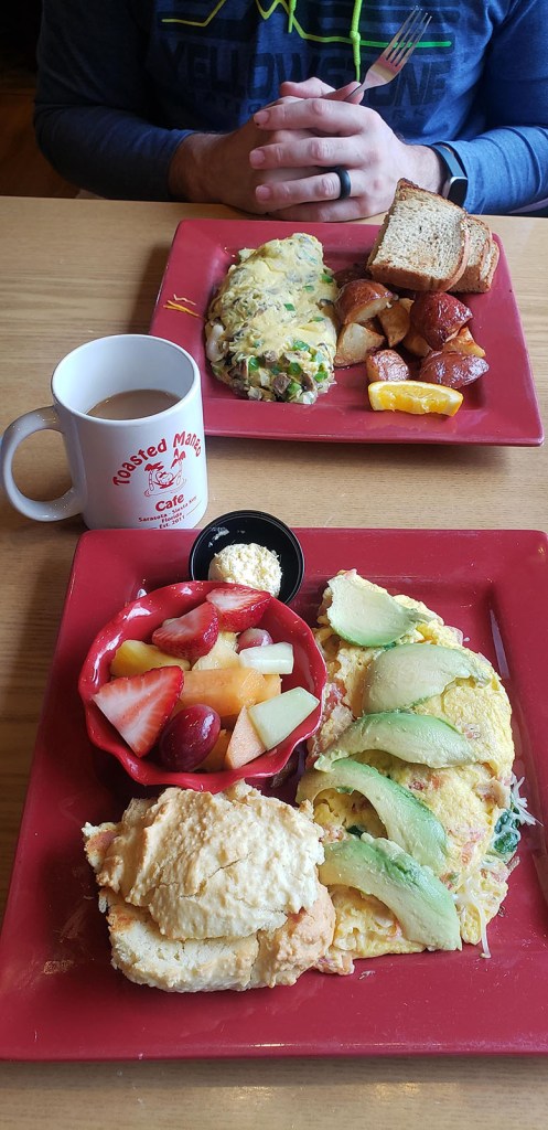The first thing we did once we got out of bed was head straight to the beach. The tide was lower than when we were there the day before and we saw tons more shells picking up a few as souvenirs. Since we didn’t have our grocery order yet, we walked to The Toasted Mango for breakfast. I had a made to order omelet with sausage, onion, peppers, and mushrooms. Jill ordered the Sarasota omelet: spinach, tomato, turkey, cheese, and avocado. We had a nice view of a small pond out of our window and watched many birds flying around that we don’t typically see back in Iowa. One of my favorite things about traveling is the novelty of seeing new plants and wildlife.