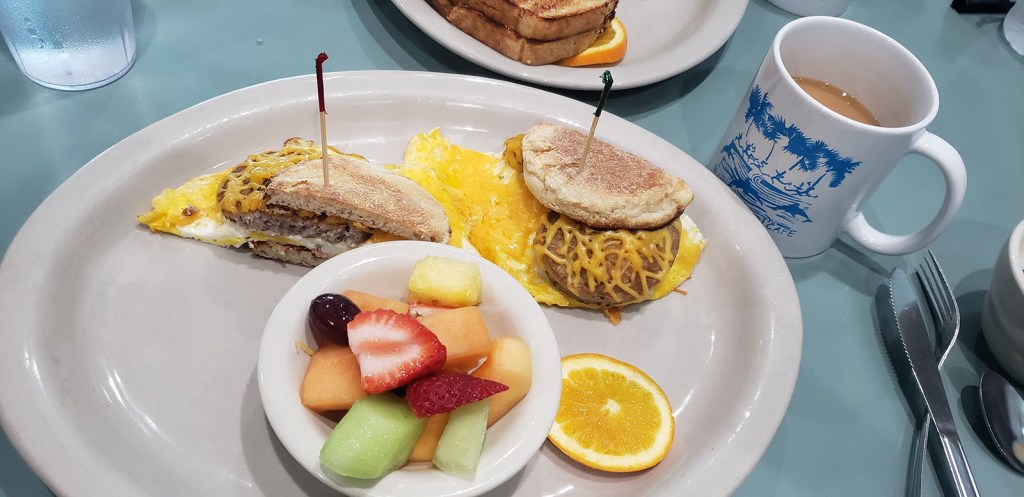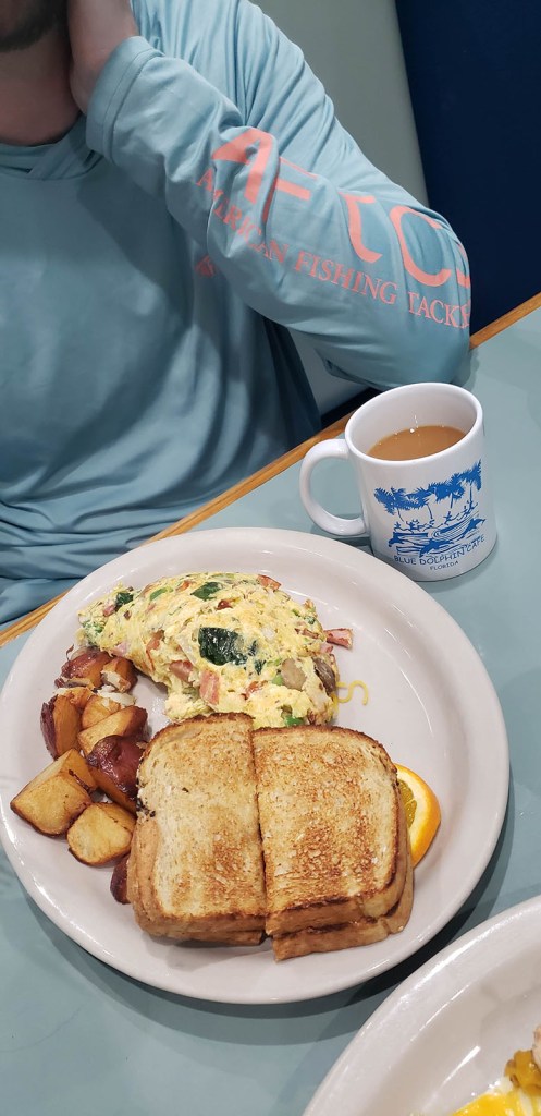 When we woke up, we weren’t sure how easy it would be to get an Uber so we checked the availability and made a plan to get to Lido Key in plenty of time for our kayaking reservation. The way things were looking, we would have a little under an hour to get some coffee and something for breakfast. Luckily, The Blue Dolphin Cafe wasn’t super busy and the service was quick (and very pleasant I might add). I went with The Everything Omelet and Jill had a Sausage Breakfast Sandwich with her coffee. The service simply couldn’t have been any better.
