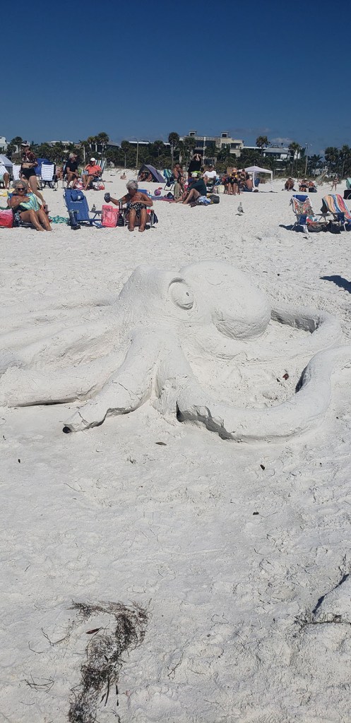 Once we turned all of our kayaking gear in and got our land legs back under us, we walked towards Lido Beach and took that back to St Armands Circle, a large business area with restaurants and shops. We did a bit more shopping, but ended up buying nothing. We did buy ourselves some lunch and a couple of adult beverages from the Madison Ave Cafe and Deli, however. Jill had a Mondello sandwich (cold) and a grapefruit-raspberry seltzer and I had a Corona with lemon and a chicken wrap. I initially didn’t want an adult beverage, but once that first sip hit my lips, the rest went down reeeeal easy.