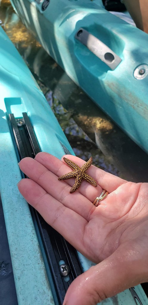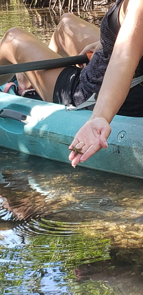 Once the tide had risen enough, we paddled south (into the wind) and found our first mangrove tunnel to paddle through. The paths were marked with big numbers on buoys and with the laminated map they provided us with, charting our path was only mildly difficult. It was nice to get out of the wind and I welcomed the shade and the break on my now sun burned skin. The water was super clear so you could see right down to the bottom of the paths that we paddled down. We could see all kinds of little creatures like fish, crabs, and starfish and we also saw different crabs and birds in the trees. At one point we stopped on a little beach and Sea Biscuit was there with a small group he was guiding. He showed us the crabs that lived in the sand there and told us all about them.